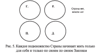 Totalinės krizės atveju, kuris yra mistinis Rusijos žlugimas ir dezintegracija, virtualios šalies pogrupiai: Valstybė, Tėvynė, Gamyba ir Pinigai “bėga”, iki tokio lygio, kad jų prisilietimas išnyksta tarpusavyje.Tik tokiu atveju Šalis nustoja egzistuoti, nes Galia, kuri įmanoma tik jos keturių pogrupių sankirtoje, visiškai išnyksta. Taip yra tada, kai K. Omae keturi “ir“ pasaulyje be sienų informacijos srautui, pinigams, žmonių masėms ir perkeltoms pramonės šakoms daro Galios, o kartu ir Šalies, egzistavimą nereikalingą. Kiekvienas šalies pogrupis pradeda gyventi tik sau ir tik pagal savo įstatymus. Tiesa, tai trunka neilgai, nes aplink yra pakankamai jėgų, kurios sugeba sustabdyti išcentrines recesijos jėgas ir įtraukti savo šalis į sistemą. (Pav. 5.)