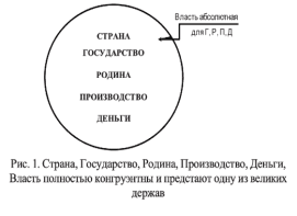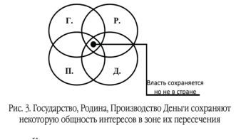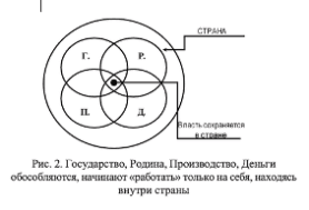 Valdžia – atsiranda tik Šalies erdvėje – ten, kur Tėvynė, Valstybė, Gamyba ir Pinigai susikerta arba yra VISIŠKAI SUJUNGTI. Būtent šioje sankirtoje atsiranda jėga, galinti reguliuoti jų santykius. Kuo platesnė ir gilesnė jų tarpusavio sankirtos zona, tuo stipresnė galia. Jokios sankryžos, jokios šalies, jokios galios. Šiandien Rusijoje, kaip ir kitose šalyse, vyksta šių pogrupių atskyrimo procesas: Tėvynė atitrūksta nuo valstybės, gamyba palieka šalies teritoriją, pinigai praranda ryšį su realiąja ekonomika. Norint sustabdyti krizę, būtina grąžinti šiuos elementus šalies viduje, užtikrinti jų sąveiką ir sudaryti sąlygas jų organinei sankirtai. Tik tokiu būdu galima atkurti visuotinai pripažintą Galią. Be to, nei vieningi Įstatymai, nei politiniai sprendimai NEGALIOS. Visi bandymai primesti įstatymus atskirai Tėvynei, atskirai gamybai ar atskirai pinigams yra pasmerkti nesėkmei. Įstatymai, sukurti NEATSIŽVELGIANT į visų keturių pogrupių interesų sankirtą, bus sabotuojami visuomenės nesąmoningame lygmenyje. Žmonės visada ras būdą, kaip apeiti tokius įstatymus, ir būtent tai šiandien vyksta Rusijoje.